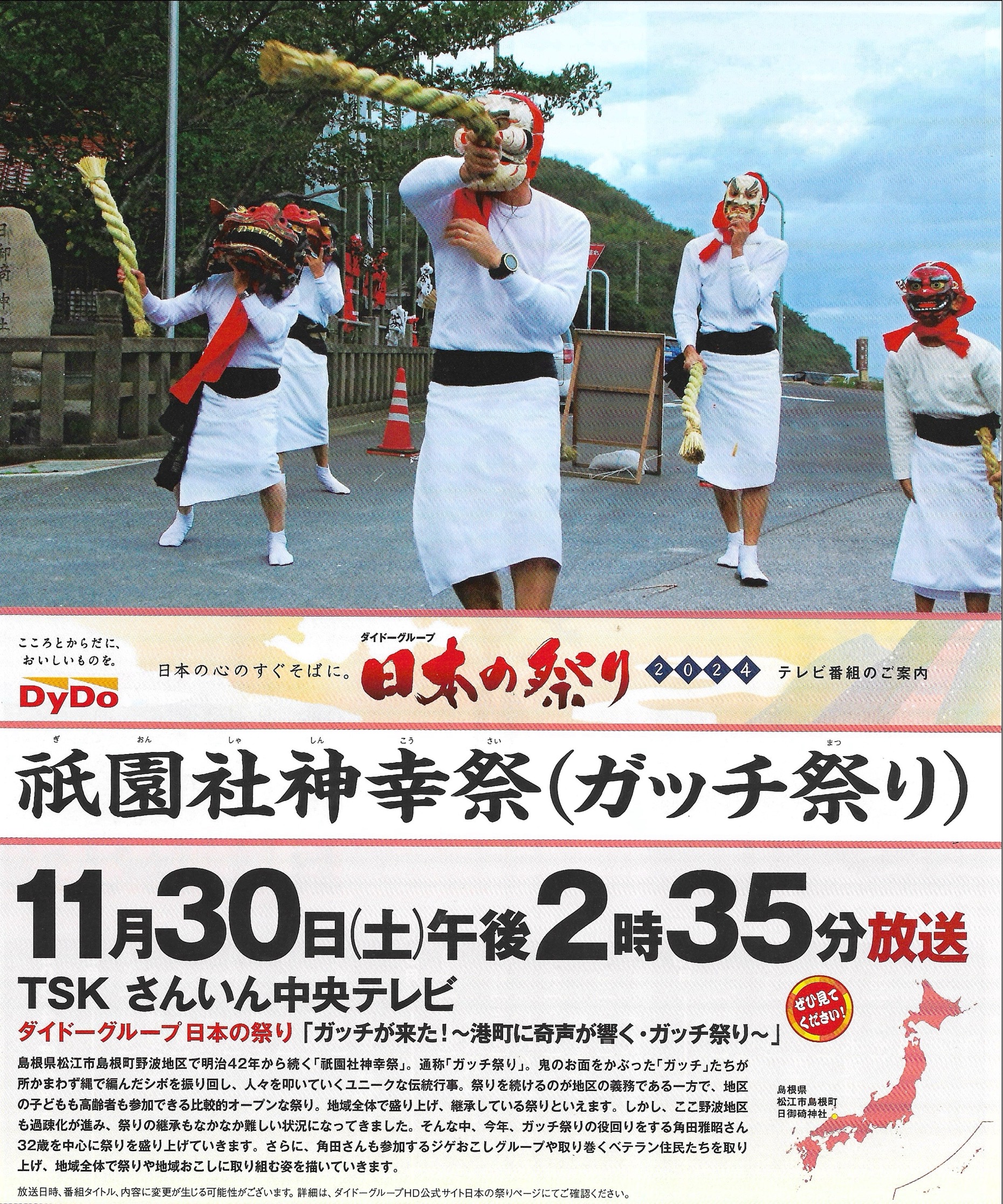 ガッチ祭りのドキュメンタリー番組(「ダイドーグループ日本の祭り2024」)が、11月30日(土)午後2時35分よりTSKさんいん中央テレビで放送されます!今後BS12トゥエルビにて全国放送も予定されています。乞うご期待!!